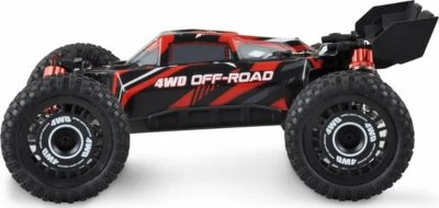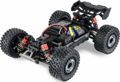 Mit diesem Buggy kommt Fahrvergnügen auf neuem Level! Ausgestattet ist der coole Flitzer mit Gummireifen, die vor keinem Gelände Halt machen und mit dem Brushless Racing Motor (2845) sind hohe Racing-Geschwindigkeiten von bis zu 65 km/h möglich. Alle Antriebskomponenten sind aus Metall gefertigt und bestechen durch ihre Langlebigkeit. Die spritzwassergeschützte Elektronik ist für alle Outdoor-Einsätze geeignet und das einstellbare Fahrwerk sorgt für mehr Spurtreue. So bleibt die Konkurrenz zurück. Coole Wheelies sind dank im Lieferumfang enthaltener Wheelie-Bar kein Problem und die handliche 3-Kanal Fernsteuerung übermittelt alle Funktionen störungssicher. Das Modell kommt als RTR-Paket (Ready-to-Run), d.h. alle Komponenten – bis auf haushaltsübliche Batterien für die Fernsteuerung – sind bereits im Lieferumfang enthalten.