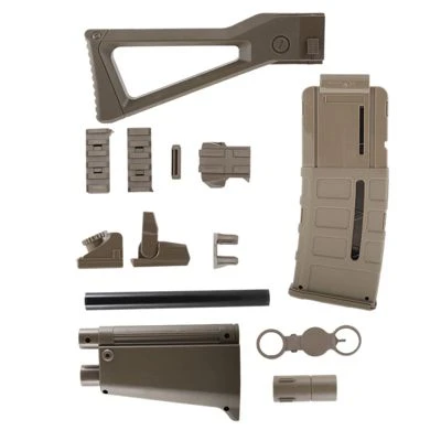 Bring deine Blaster optisch auf das nächste Level!Das Blasterparts SMG-Kit 1 verwandelt die orange Stryfe, Elite 2.0 Phoenix CS-6, Nerf Alpha Strike Flyte CS-10 und weitere Blaster äußerlich äußerlich in eine MP5. Durch die enthaltenen Anbauteile, die einfach auf die Aufnahmen und Aussparungen des Blasters aufgesteckt werden können, wird eine realistische Optik erreicht. Ein bisschen zusätzliche Farbe kann das Erscheinungsbild noch weiter abrunden.Modular und RückbaubarDie Einzelteile des Sets können auch unabhängig voneinander dazu verwendet werden um das Äußere der Stryfe oder 2.0 Phoenix CS-6 zu verändern. Zudem können die Teile einfach wieder abgenommen werden, falls der Blaster für ein anderes Setting oder einen anderen Anlass anders aussehen soll oder eine Verlängerung des Laufes nicht erwünscht ist.Was ist ein Body Kit?Wenn bei Blastern von Body Kit oder Modding Kit die Rede ist, sind nicht selten Anbeuteile gemeint. Die meistens als kompletter Bausatz montiert werden. Ein typischer Bausatz besteht aus einer Schulterstütze, einen Frontlauf und einem Visier. In einigen Fällen kommen kleine Lückenfüller Teile (“Gap Closer”), Magazine, Griffe, Kimme&Korn dazu. Ein Body Kit hat den Zweck ein bestimmtes Aussehen nachzuahmen. Meist ist es einer Waffe aus der realen Welt nachempfunden. Der neue gewonnene Look ist aber nicht permanent. Er kann nach belieben wieder zurück gebaut werden. Wir empfehlen es jedem Fan es einmal mit einem Kit zu versuchen!