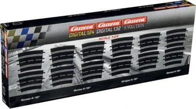 Für coole Kurven-Action: Mit diesem 12-teiliges Set „Kurven 4/15° (12)“ von Carrera kommen 12 Schienenteile zur Erweiterung der Carrera DIGITAL 124, DIGITAL 132, Carrera EVOLUTION Rennstrecken. Die 12 15°-Kurvenstücke ergeben zusammengesteckt eine großzügige 180° Kurve.