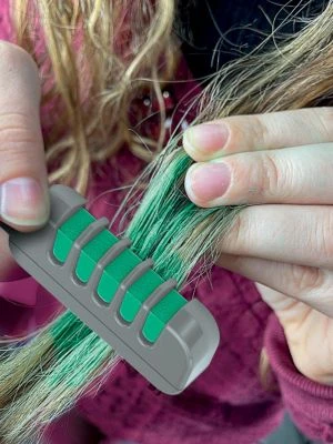 Der Rainbow High Farb-Hairstyler zaubert bunte Strähnen ins Haar! Dafür wird der Färbestift auf den Kamm gesteckt und gleitet durch die Haarsträhne. So kann jede Strähne in einer anderen Farbe glänzen.