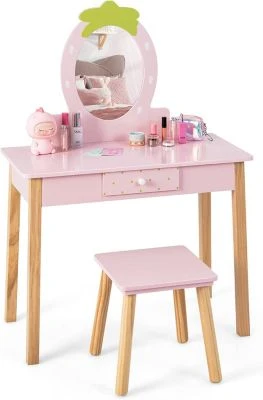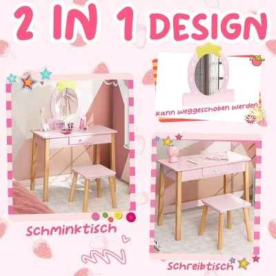 Machen Sie Ihrer kleinen Prinzessin mit diesem 2-in-1-Schminktischset für Kinder ein perfektes Geschenk! Und der Spiegel kann für eine Umwandlung zum Lerntisch wegbewegt werden. Die große Tischplatte und die praktische Schublade bieten viel Stauraum für Kindersachen. Der durchdachte Hocker ist im Lieferumfang enthalten, um Kindern eine Sitzgelegenheit zu bieten. Mädchen werden dieses Kinder-Kosmetiktischset mit einem erdbeerförmigen Spiegel bevorzugen.