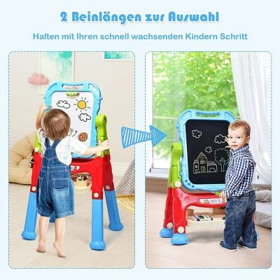 Ausgestattet mit einem magnetischen Whiteboard und einer Kreidetafelkönnen sich junge Künstler hier mit ihren Freunden kreativ ausleben. Die Tafeln sind um 360° drehbar und auch die Höhe lässt sich in zwei Stufen auswählen, je nach Größe der Kinder. Auf der Ablage lassen sichKreide, Marker, Radiergummi, Magneten usw. platzieren. Durch das umweltfreundliche PP und die stabile Struktur ist außerdem die Sicherheit der Kinder gewährleistet. Dank den Griffen kann die Tafel abgenommen und umhergetragen werden. Mit den hübschen Farben wirkt die Staffelei sehr ansprechend auf Kinder.