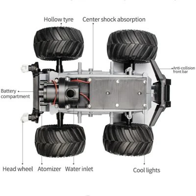 • Heckspray: Das Oberteil ist mit einem physikalischen und chemischen Wasserspeicheranschluss ausgestattet, der mit sauberem Wasser gefüllt und mit einem Knopfdruck über die Fernbedienung besprüht werden kann, was den Spaß am Autospielen erhöht.