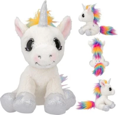 – mit bunter Regenbogenmähne, lila Glitzeraugen und Glitzer-Hufe und -Horn in Silber
