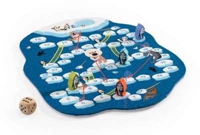 Den Spieleklassiker „Schlangen und Leitern“ gibt es jetzt in einer Neuauflage! Jeder der Spieler versucht, seine Pinguin-Figur so schnell wie möglich ins Ziel hüpfen zu lassen. Kommt die Figur auf einem Feld mit Leiter zu stehen, so darf sie auf das Endfeld der Leiter vorspringen. Kommt sie zu einer Robbe, einem Hermelin oder einem Eisbären, so wird sie flugs auf das Endfeld des Käschers zurückgeworfen. Dank des einfachen Spielprinzips können auch kleine Kinder bereits Spielregeln lernen!