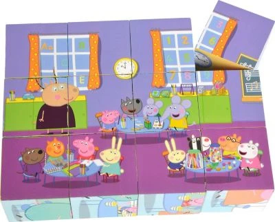 Das Würfelpuzzle von Peppa Pig besteht aus 12 verschiedenen Bausteinen, mit denen man 6 verschiedene Motive puzzeln kann.