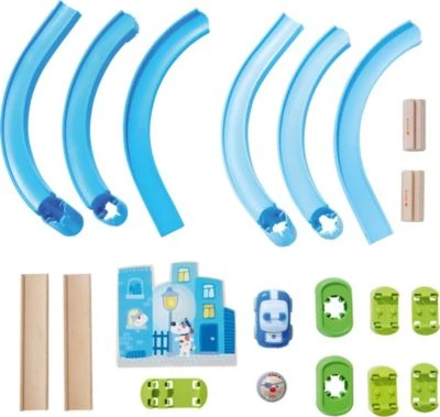 + Inhalt: 1 Kulisse „Stadt bei Nacht“, 1 Polizeiauto, 1 Kugel Rudi Räuber, 2 Universal-Steilkurven, 2 Geraden, 2 Säulen, 6 Verbindungselemente, 1 Kulissenklemme