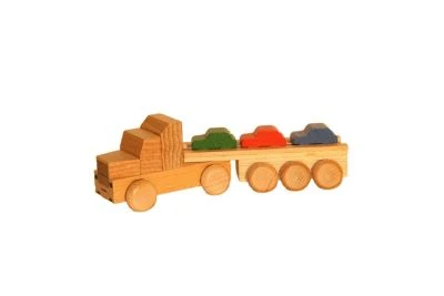 Dieser Sattelzug mit einem Autoauflieger ist genau das richtige für kleinere Kinder zum spielen. Er ist robust und komplett aus Holz hergestellt. Gefertigt wird alles in einer alten Firma, die direkt ihren Sitz im Erzgebirge hat. Der Auflieger kann auf die Zugmaschine gehängt werden. Die Zugmaschine und die Pritsche mit 3 Autos haben eine Länge ca. 15 cm und sind farbig gestaltet