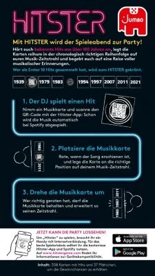 Kennst du diesen Song? Mit Hitster von Jumbo holst du dir die besten Hits aus 100 Jahren Musikgeschichte nach Hause, gratis dazu gibt es Party-Stimmung! Reist mit 300 Hits aus den letzten 100 Jahren zurück in eurer Erinnerung. Der DJ scannt mit der kostenlosen App eine Musikkarte und dann raten die Spielenden reihum, wann der Song von wem veröffentlicht wurde und wie er heißt. Wer als Erstes zehn Lieder in seinem Zeitstrahl hat, gewinnt dieses Partyspiel mit digitaler Unterstützung.