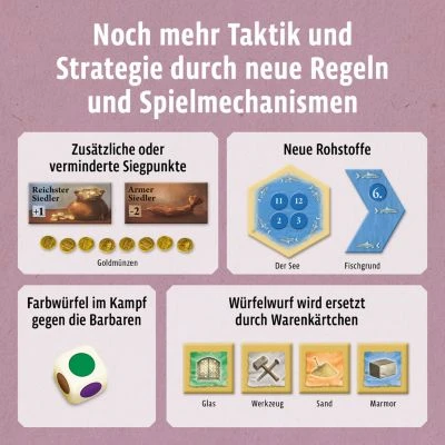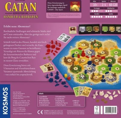 Schon wieder sind die räuberischen Barbaren über die Küstenstädte hergefallen. Wo bleiben die mutigen Ritter, die sich den wilden Horden entgegenstellen? Im Norden dagegen wird gebaut: Ein Sitz für die Herrscher – der Rat Catans. Marmor, Glas, Sand und Werkzeuge werden gebraucht. Im Süden ziehen Karawanen durch die Wüste – Nomaden tauschen ihre wertvolle Wolle gegen Handelswaren. Lenken die Spieler ihre Karawane zu ihrem Vorteil oder vertrocknen sie in der Wüste?