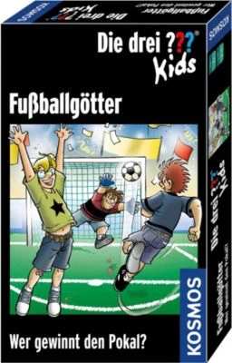 Ein Fall für die drei Fragezeichen! Mit Justus, Peter und Bob steht nichts Geringeres an, als die Rettung des wertvollen Pokals, denn der Fiesling Skinny Norris will den Fußballpokal ergattern. Mit dem actionreichen Memo- und Geschicklichkeits-Spiel Die drei Fragezeichen-Kids „Fußballgötter“ (Kinderspiel) von Kosmos geht es zum Fußballturnier. Die Spielenden helfen den drei ??? den coolen Pokal des Fußballgottes Chuichi zu gewinnen. Nur, wenn sie siegen, können sie den Pokal vor Skinny schützen. Zunächst geht es hierbei um ein gutes Gedächtnis, denn die Spielenden müssen sich über die umgedrehten Memo-Karten in Richtung Tor spielen. Die Farbe des Würfels zeigt die Hintergrundfarbe des Detektivs der als nächstes angespielt werden muss. Schafft es ein Detektiv vor das Tor, so geht es zum Torschuss. Hierfür liegen Bälle und ein Chip bereit. Wer die meisten Tore schießt, gewinnt das Spiel und holt den begehrten Pokal. Spannendes Geschicklichkeitsspiel für alle Detektiv- und Fußball-Fans!