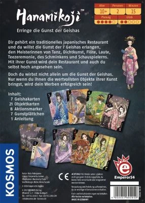 Inhalt: 7 Geishakarten, 21 Objektkarten, 8 Aktionsmarker, 7 Gunstmarker, Spielanleitung