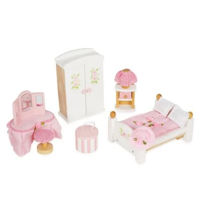 Ein bemaltes Set mit 16 Teilen, ein Doppelbett mit Bettwäsche, Kleiderschrank mit Kleiderbügeln, Schminktisch und Nachttisch. Beinhaltet sämtliches Zubehör wie abgebildet. Ideal für alle Le Toy Van Puppenhäuser.