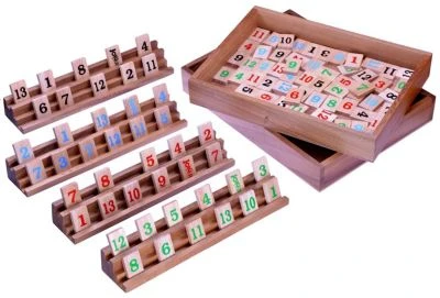 • SpielbeschreibungGewonnen hat der Spieler, der als Erster seine Spielsteine ausgelegt hat.Hat ein Spieler erst einmal eine eigene Zahlenreihe von mindestens 30 Punkten ausgelegt, darf er anschließend einzelne Steine an bereits vorhandene Zahlenreihen anlegen oder diese Zahlenreihen umbauen. Die vier Joker des Spiels dürfen dabei als Ersatz für beliebige Spielsteine eingesetzt werden.Rummy ist ein sehr spannendes Legespiel, bei dem neben dem Glück, die passenden Spielsteine zu bekommen, auch Strategie und kombinatorische Fähigkeiten zum Erfolg beitragen.