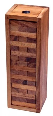 • SpielbeschreibungDie Spieler ziehen abwechselnd einen beliebigen Stein aus dem unteren Teil des Turmes und legen ihn in der richtigen Anordnung – also abwechselnd längs und quer – oben wieder auf. Im Laufe des Spieles wird der Turm instabil. Der Spieler, der durch Herausziehen eines Steines den Einsturz des Turmes verursacht, hat verloren und muss den Turm neu aufbauen.