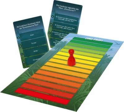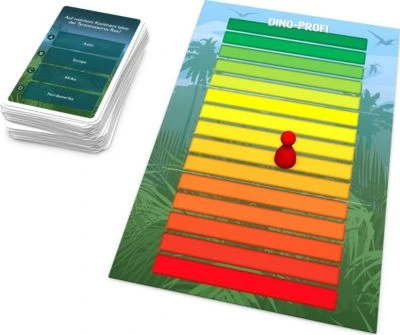 Was ist die Trias? Welcher Dinosaurier war der cleverste? Und legen eigentlich alle Dinos Eier? Bei dem Noris Quiz „Welt der Dinosaurier“ kann man viel zum Thema Dinosaurier lernen oder das eigene Wissen unter Beweis stellen. Gemeinsam versucht ihr Fragen zu beantworten, um mit der Spielfigur auf dem Spielplan vorzurücken. Je nach Schwierigkeitsgrad müsst ihr verschieden viele der 110 Fragenkarten meistern, um ins Ziel zu kommen. Wer gerade am Zug ist, darf die Antwort direkt äußern. Bist du dir bei der Antwort jedoch unsicher, kannst du dein Mitspielenden-Team befragen. Je nachdem kommt ihr langsamer oder schneller auf dem Spielplan voran. Es gibt auch eine Spielvariante für eine Person.