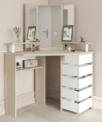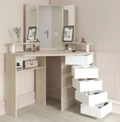 Lieferumfang: Eck-Schminktisch, Montagematerial und Montageanleitung (ohne Hocker und Dekoration)
