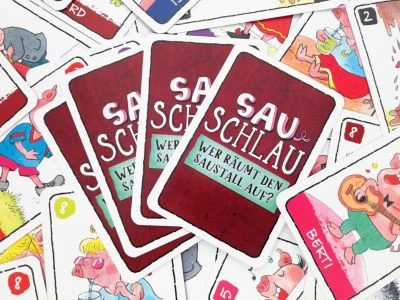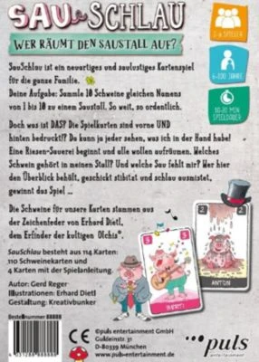 SauSchlau ist ein neuartiges und saulustiges Kartenspiel. Es besteht aus 114 Karten: 110 Schweinekarten und 4 Karten mit der Spielanleitung drauf. So weit, so ordentlich. Doch was ist DAS? Die Spielkarten sind vorne UND hinten bedruckt. Da kann ja jeder sehen, was ich in der Hand habe!? Der SauSchlau-Klau beginnt… Welches Schwein gehört in meinen Stall? Und wo steckt meine Sau? Wer den Überblick behält, geschickt stibitzt und ausmistet, gewinnt das Spiel… Die Schweine für unsere Karten stammen aus der Zeichenfeder von Erhard Dietl, dem Erfinder der Olchis®.