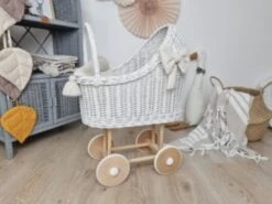 TinaForKids Puppenwagen Mit Bettwäscheset Aus Weiden Und Holz, Weiß/Natur