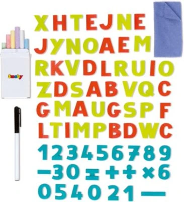 Mit Spiel und Spaß beim Lernen! Die doppelseitige Schreib- und Kreativtafel aus robusten Holz und hochwertigen Kunststoff. Holztafel von Smoby mit Kreide, Filzstift und Magnetbuchstaben zusammenklappbar Maße: 50(L) x 55(B) x 120(H) cm ab 3 Jahren Auf der magnetischen Kunststoffseite können die Kids ihrer Fantasie freien Lauf lassen: mit wasserlöslichen Filzstiften sowie den 72 Magnetbuchstaben und -zahlen. Die schwarze Tafelseite bietet viel Platz für Schreib- und Rechenübungen mit Kreide. Die Holztafel verfügt über zwei Ablagen für die Stifte, sowie eine Aufbewahrungsbox aus Kunststoff, die einfach an der Seite befestigt werden kann und in der sich die Magnetbuchstaben und -zahlen aufbewahren lassen. Auf jeder Tafelseite befindet sich zusätzlich oben ein Papierclip. Das Zubehör umfasst insgesamt 80 Teile: Kreide-Set, bestehend aus 6 verschiedenen Farben, Schwamm, ein abwischbarer Stift, sowie 72 Magnetbuchstaben und -zahlen.