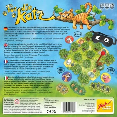 Für 2 bis 5 Spieler: Das Spiel eignet sich hervorragend für alle Jungen und Mädchen, natürlich besonders für Geschwister. Für ältere Kinder ab 5 / 6 Jahren kann man mehrere Teams zusammenstellen und höhere Anforderungen stellen. Zoch Für die Katz Gesellschaftsspiel Inhalt: Spielplan, 12 Baumstämme, 21 Baumkronen, 12 Tierkarten, 1 Wanderstab, 1 Augenbinde, Spielregeln, für 2 bis 5 Spieler, Spieldauer ca. 10min, ab 4 Jahren.